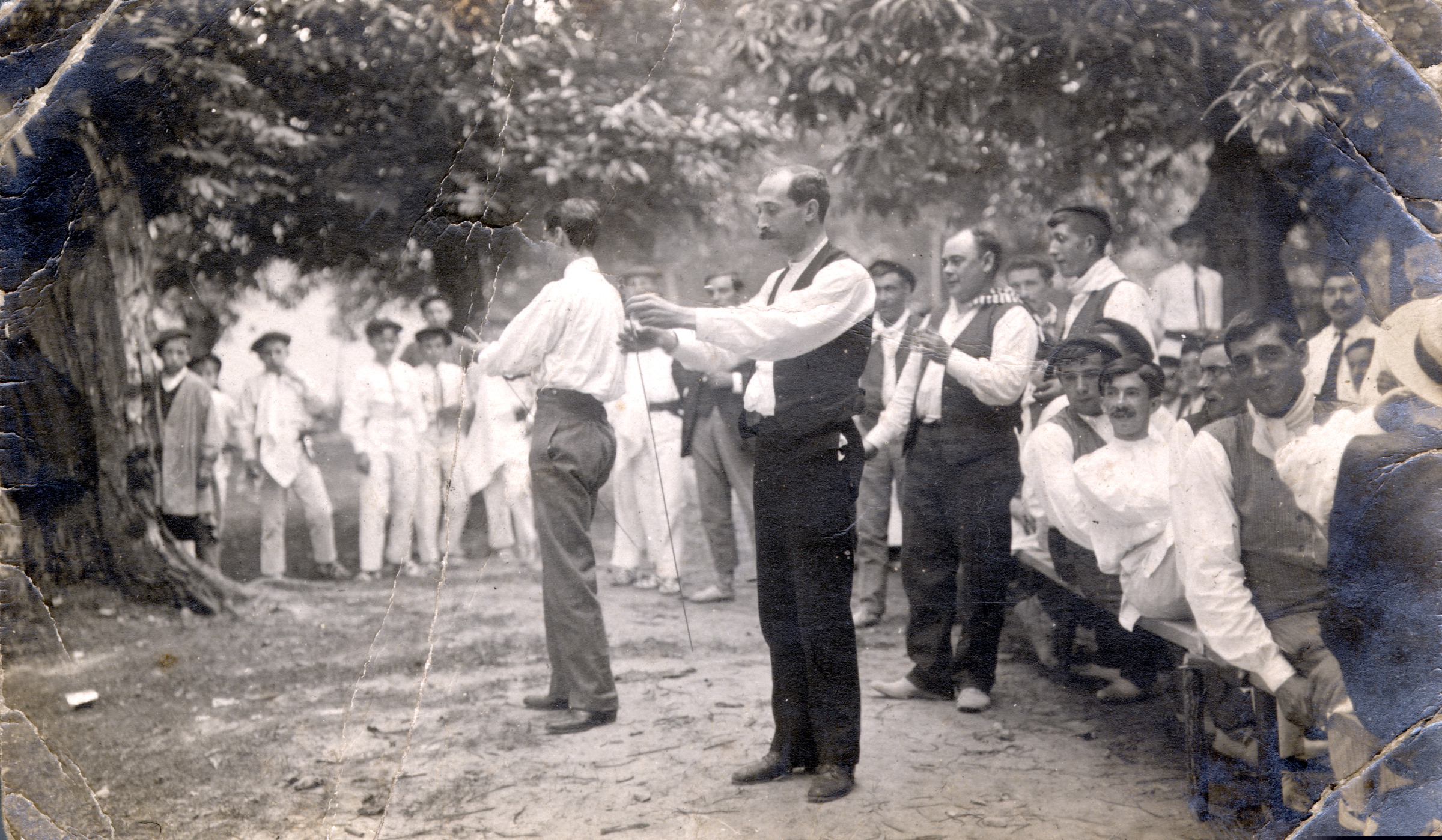 | En la campa de San Marcial un hombre lanza un chaflero y la gente a su alrededor observando |