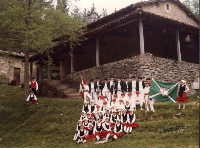 | Grupo de dantzaris y txistularis de la ikastola Aranzadi frente a la ermita de San Marcial |