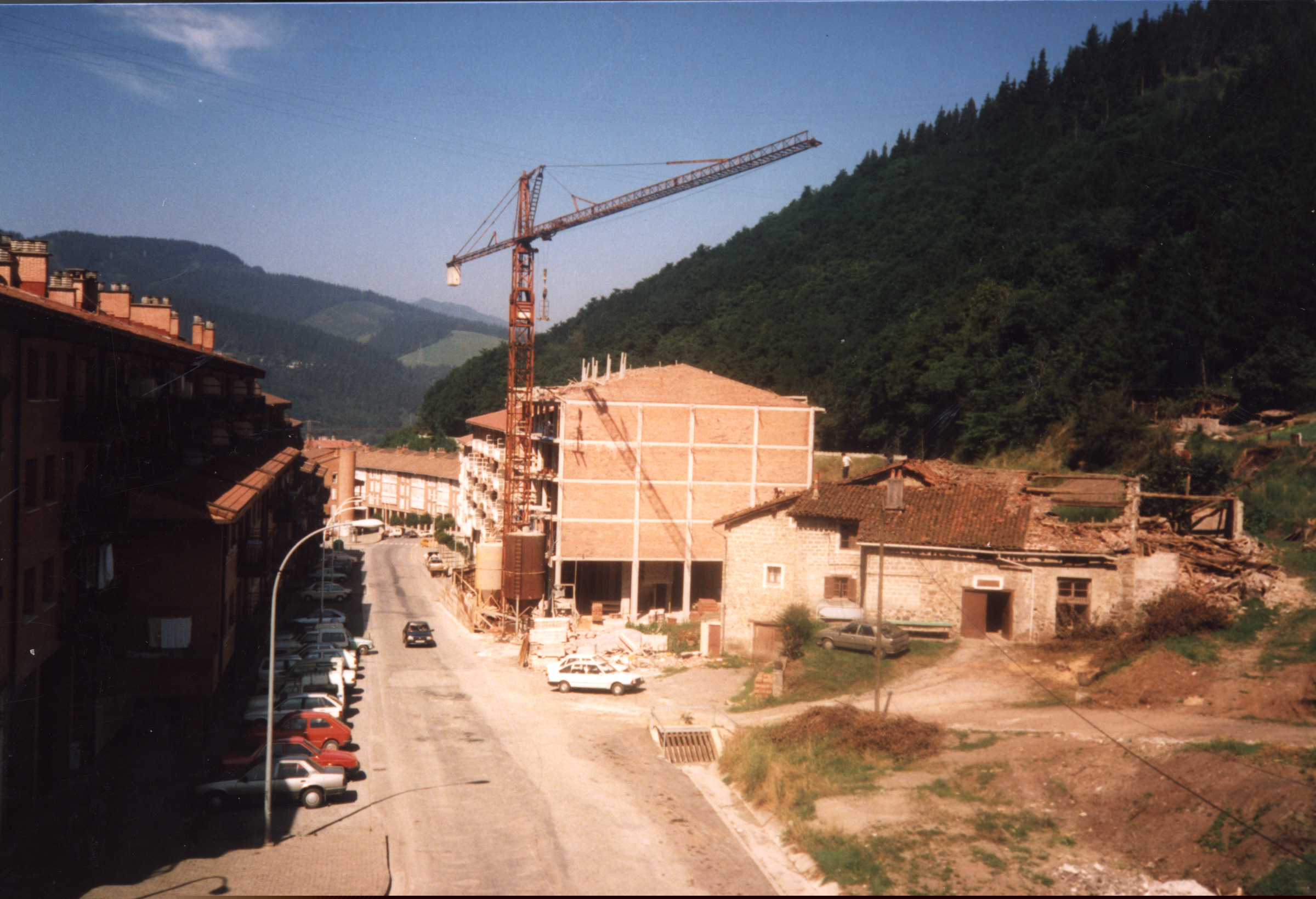 | Aranerreka visto desde arriba. Construyendo las viviendas de la derecha, hay una grua. Se ve el caserío Perulde y Aranerreka 27 sin construir |