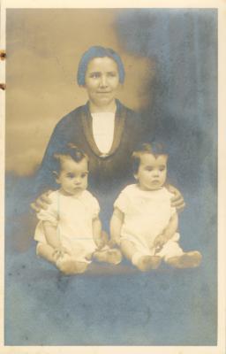 Una mujer con dos niños en el regazo |