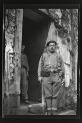 | Retrato de dos hombres uniformados frente a un caserío; uno medio oculto alrededor de la puerta | Victorino Irigoyen |