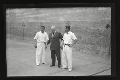 | Dos pelotaris y el juéz en el frontón | 9abril 1944. Campeonato de pelota Felipe-Atano VII xxx nº 14 A |
