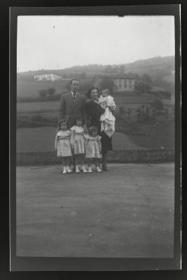 | Una familia. El hombre y la mujer tienen cada uno un bebé en sus brazos y otros dos están de pie |