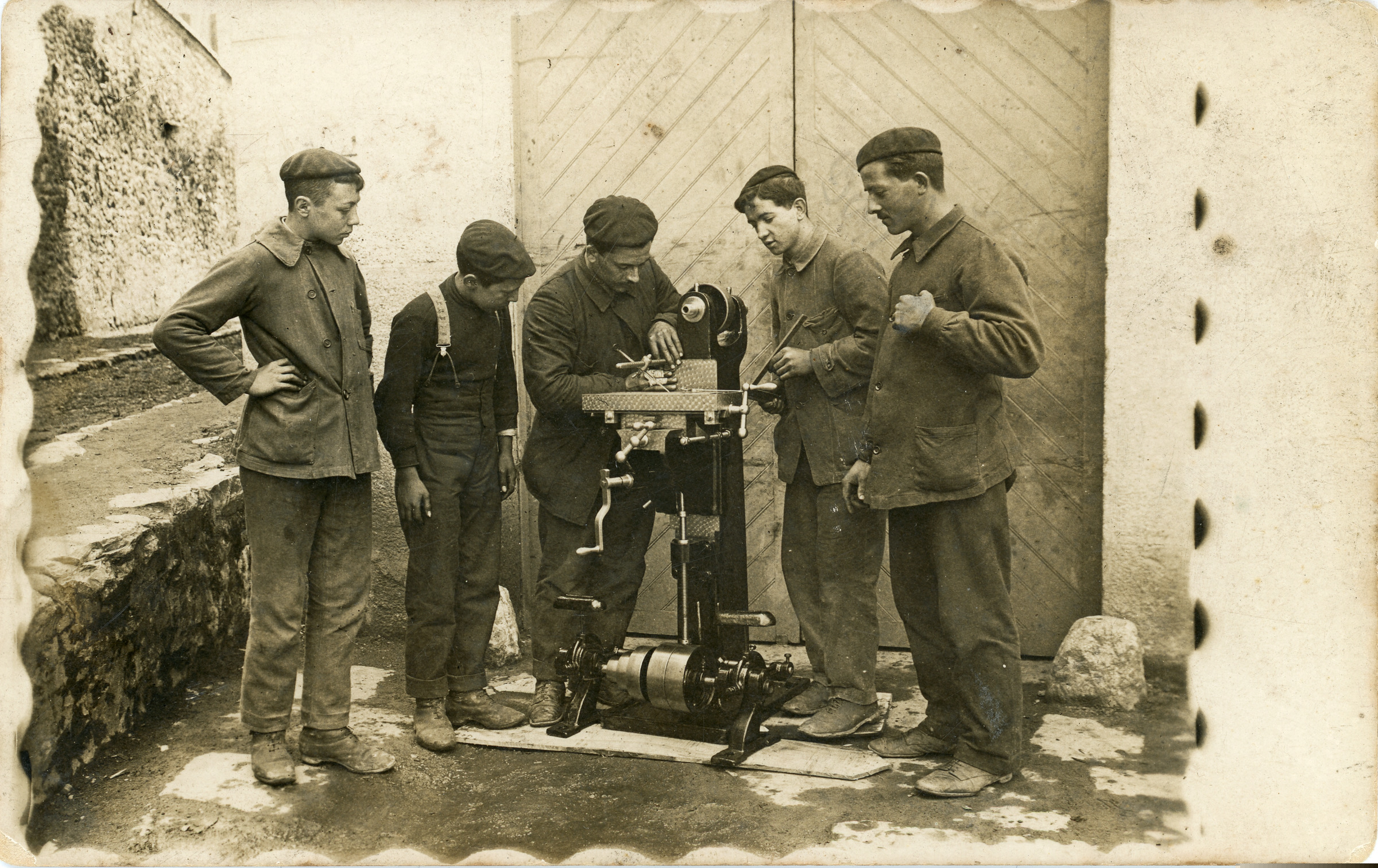 | Cinco hombres con una fresadora. La fresadora está fabricada en el taller mecánico Urbano López |