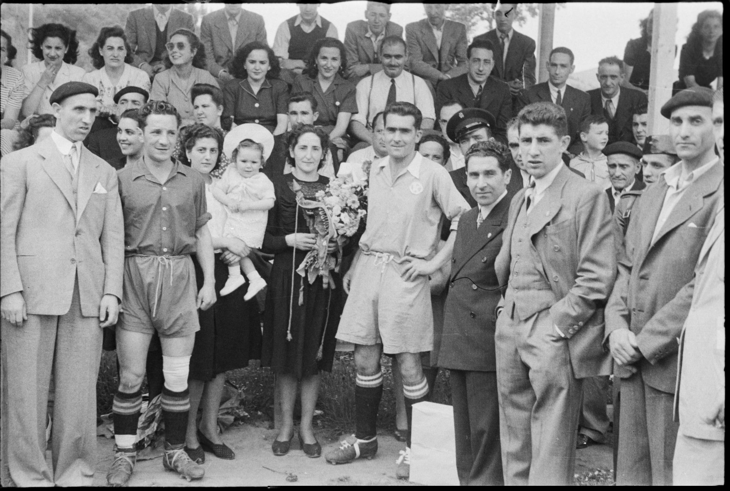 Equipo de fútbol y miembros del Club Deportivo en el V aniversario de Zabala | Homenaje a V. Zabale.- S. Arrieta (presidente) [Fútbol.- año 1946] |