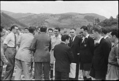 Equipo de fútbol y miembros del Club Deportivo en el V aniversario de Zabala | Homenaje a V. Zabale.- S. Arrieta (presidente) [Fútbol.- año 1946] |