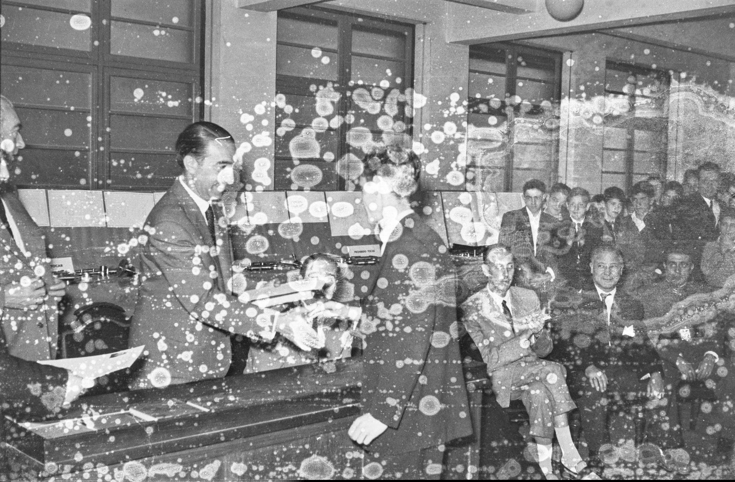 | Hombres sentados, y unos de pie. El que esta de pie tiende la mano al chico |