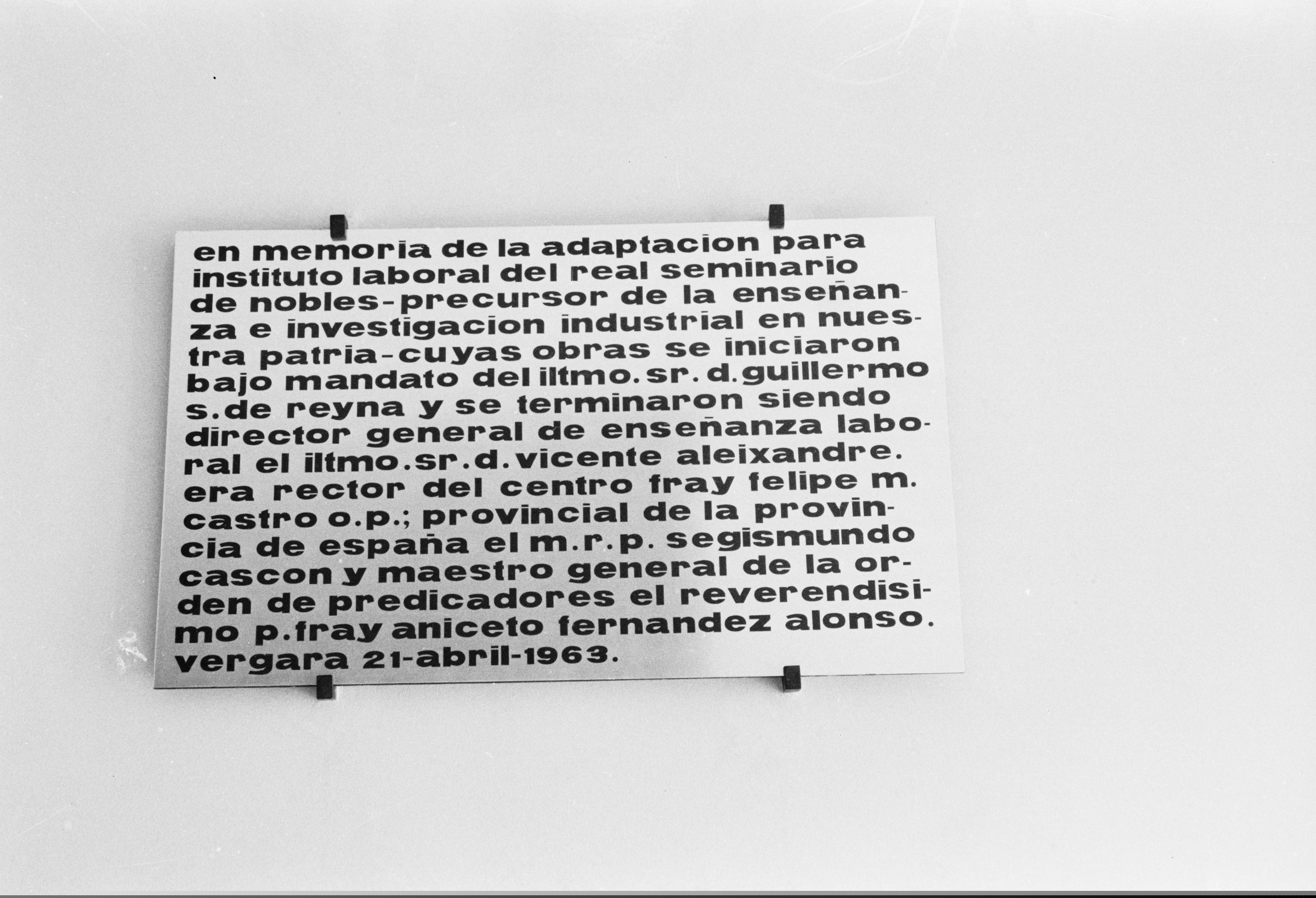 | Placa testigo de las obras realizadas en la iglesia del Seminario | Interiores iglesia y talleres Seminario abril 1963 |