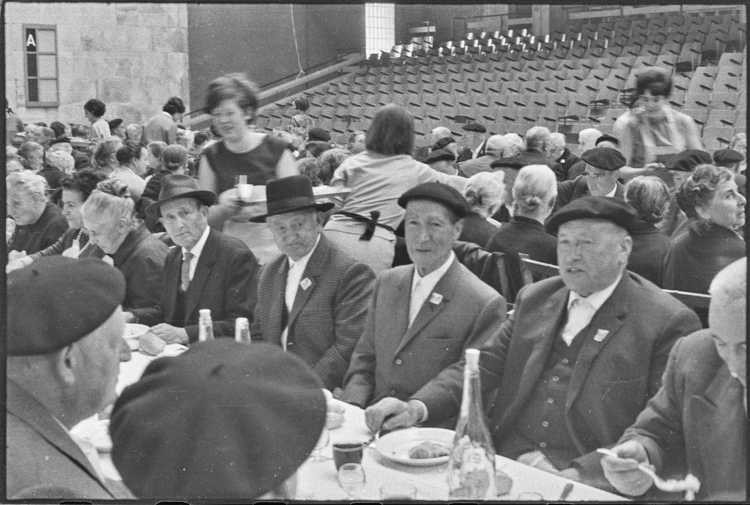 | Comida en el Frontón Municipal. Gente comiendo. | Jubilados - Del 1 al 63 30-abril-1967 |