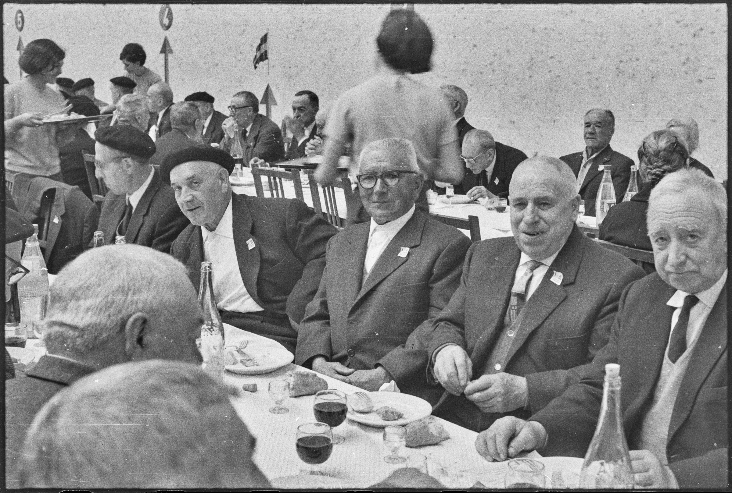 | Comida en el Frontón Municipal. Gente comiendo. | Jubilados - Del 1 al 63 30-abril-1967 |