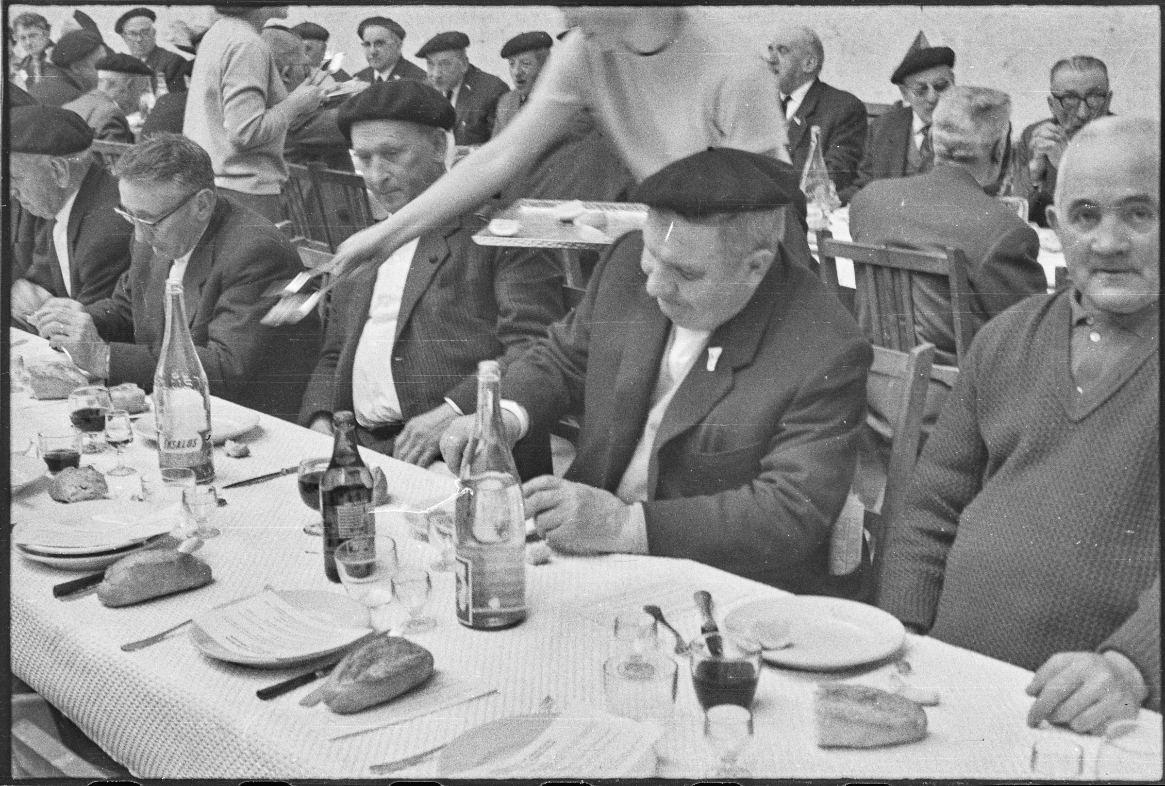 | Comida en el Frontón Municipal. Gente comiendo. | Jubilados - Del 1 al 63 30-abril-1967 |