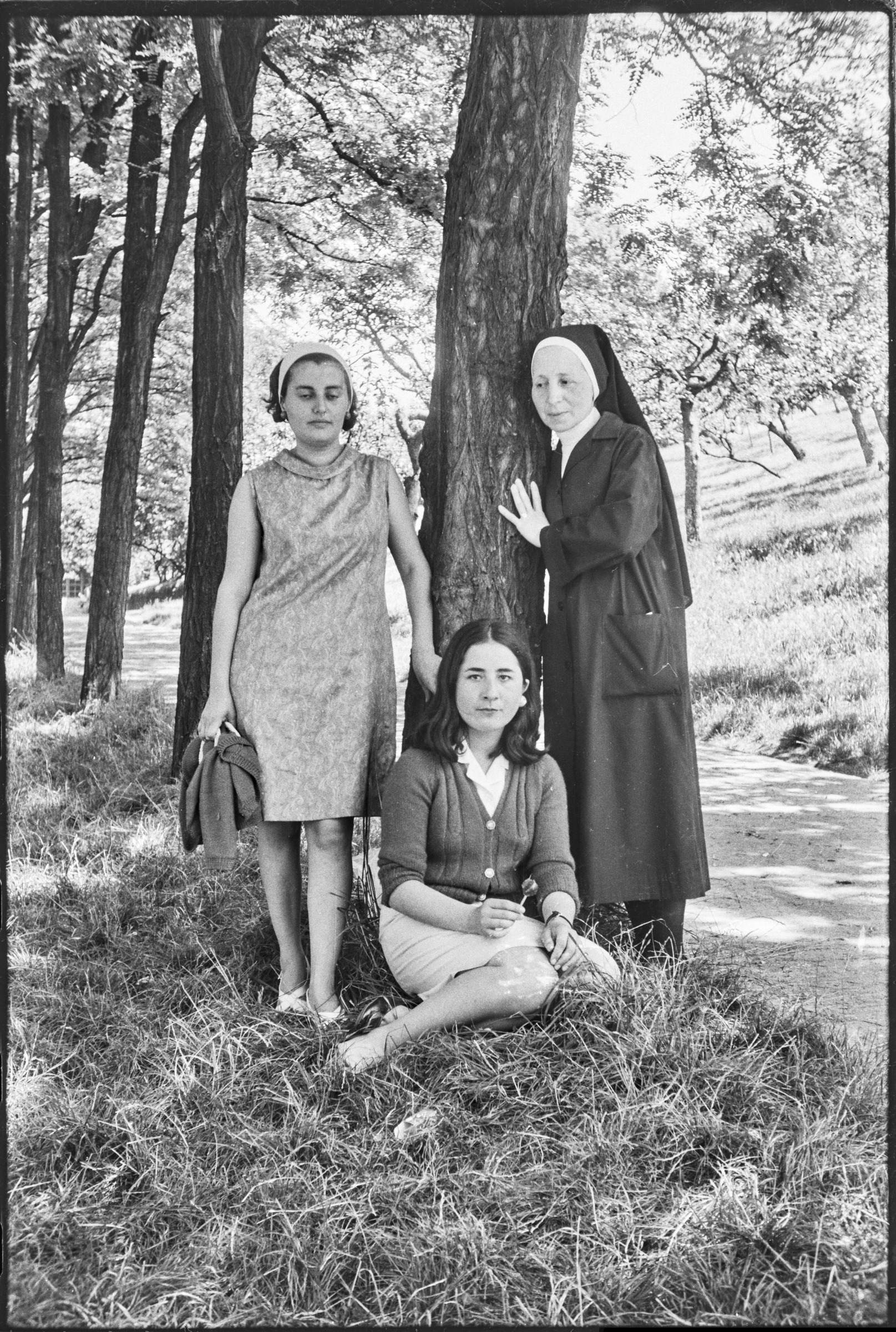 | Una monja y dos mujeres junto a un árbol | Enseñanza Párvulos 28-VI-968 |