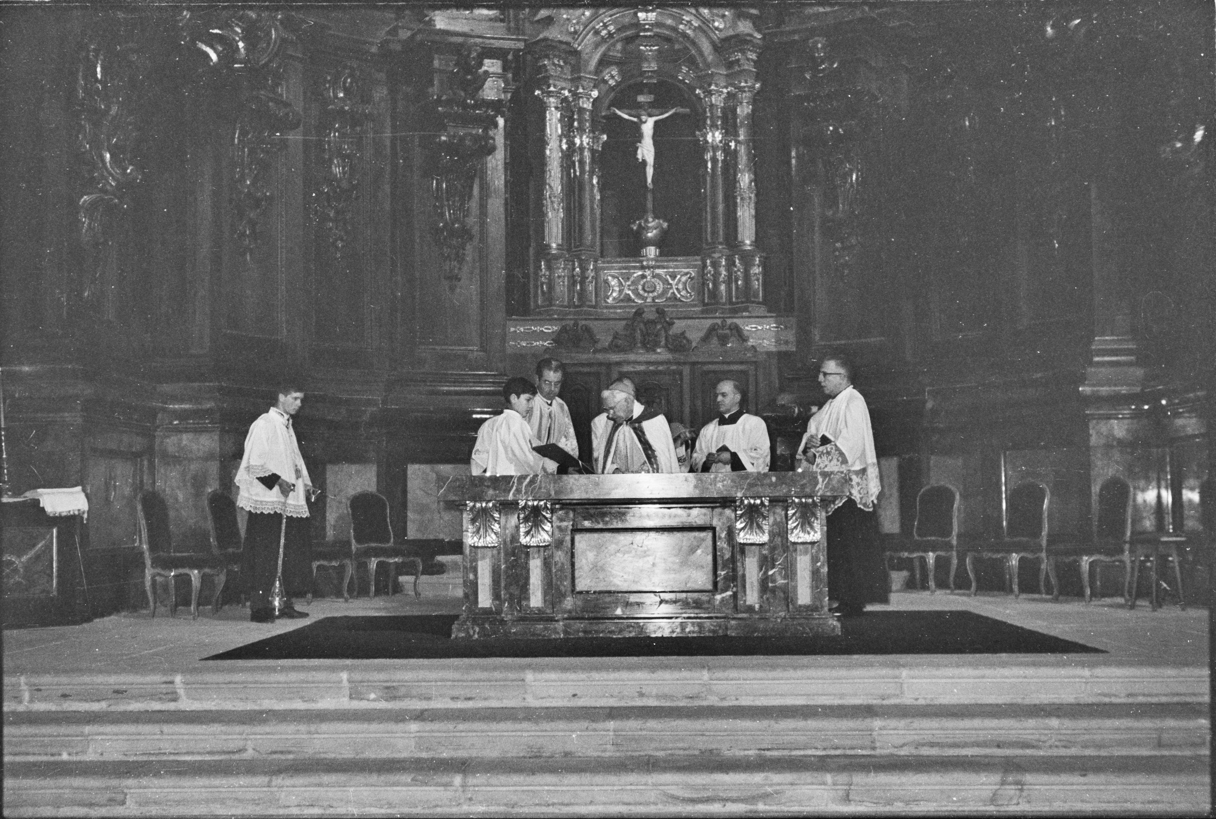 | Un gran grupo de sacerdotes oficiando misa. | Obras altar Santa Marina - Bendición 4-febrero-1968 |