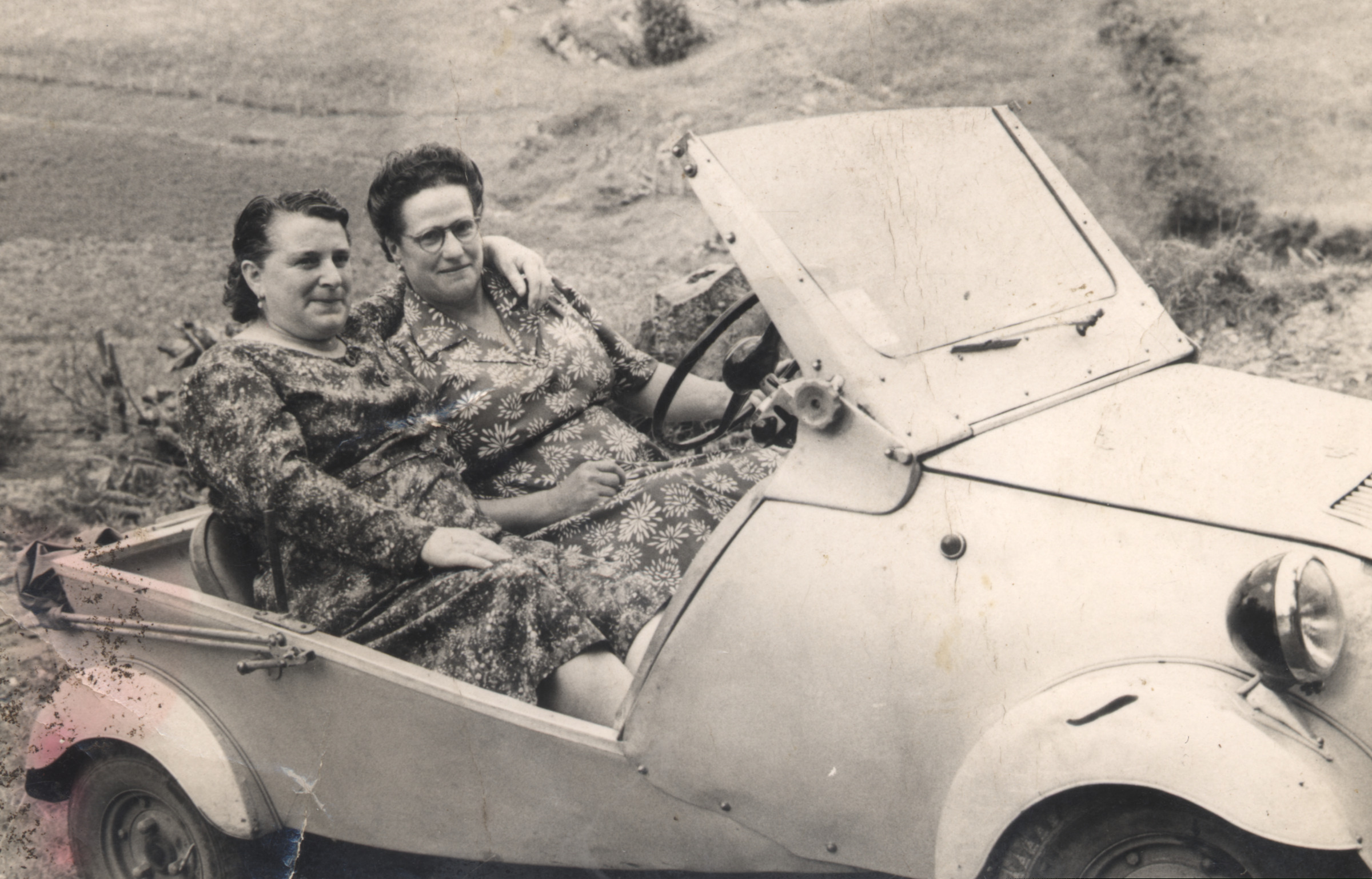 Dos mujeres en una Biscooter | "7 jul 1957 Foto Mayora Bodas, banquetes etc. Mª Angela nº 19-5.º Telefono 72070 Eibar" [imp. v.] |