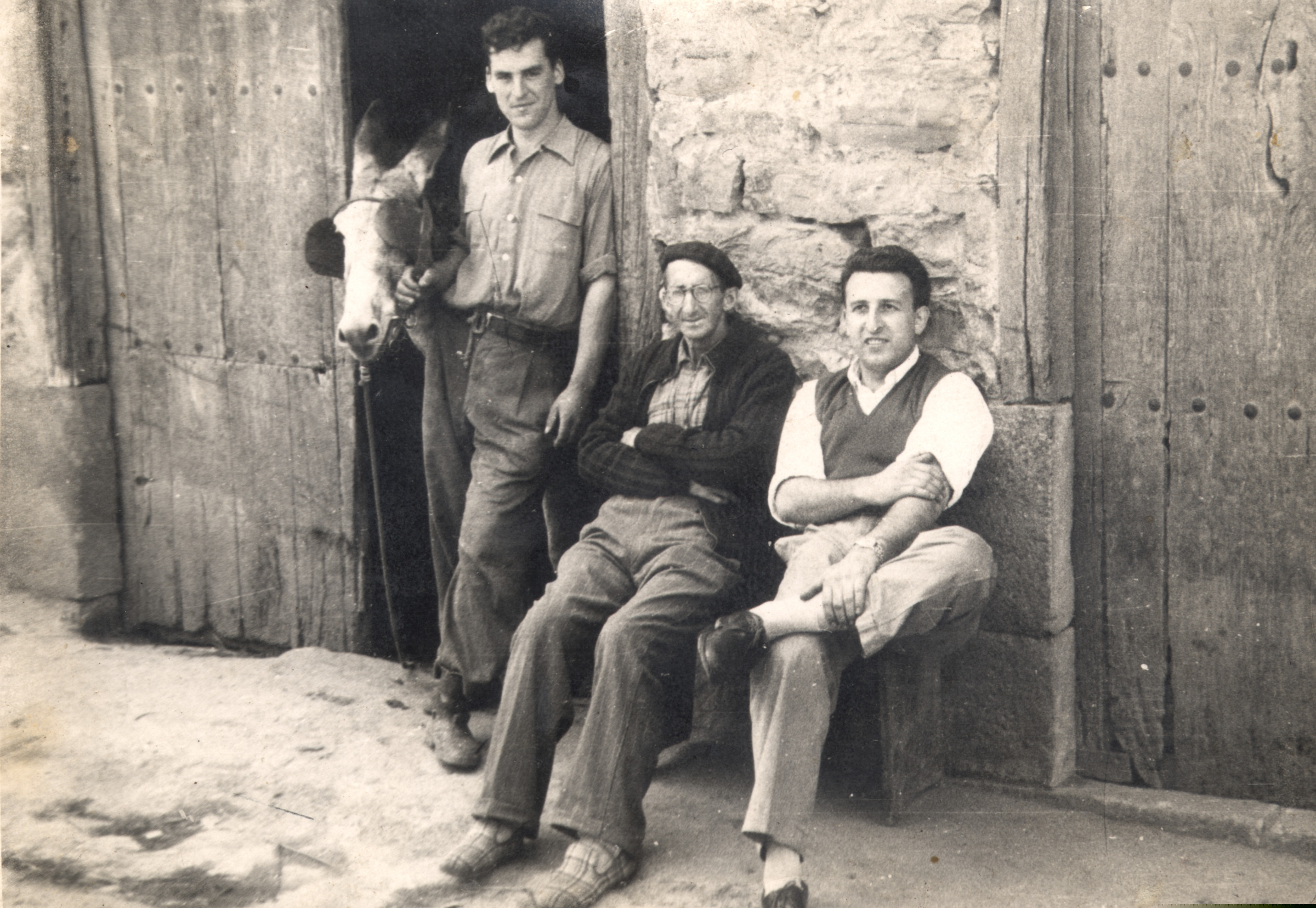 | Tres hombres y un burro frente a un caserío |