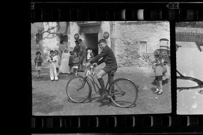 Un niño montado en la bicicleta, detrás los niños que han hecho la primera comunión están con sus familiares. |