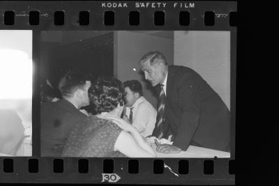 Gente sentada alrededor de la mesa, un hombre de pie hablando. |