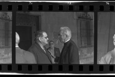 Dos hombres hablando en el pórtico. |