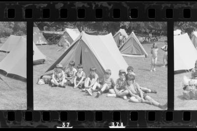 Niños sentados delante de una tienda de campaña en Gorla. |