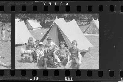 Niños sentados delante de una tienda de campaña en Gorla. |