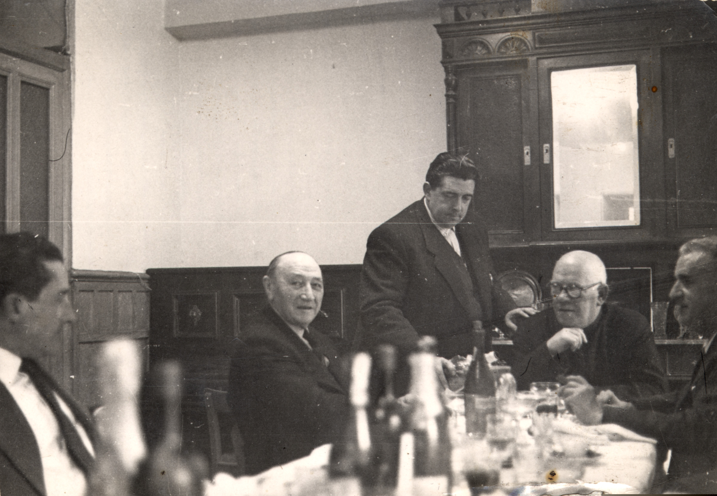 Grupo de hombres en el restaurante Gaspar | "1957" "Cristobal Sanginés, Estanislao Ecenarro, D. Salvador Irigoyen, D. Luis Zabala" [m.s. v.] |