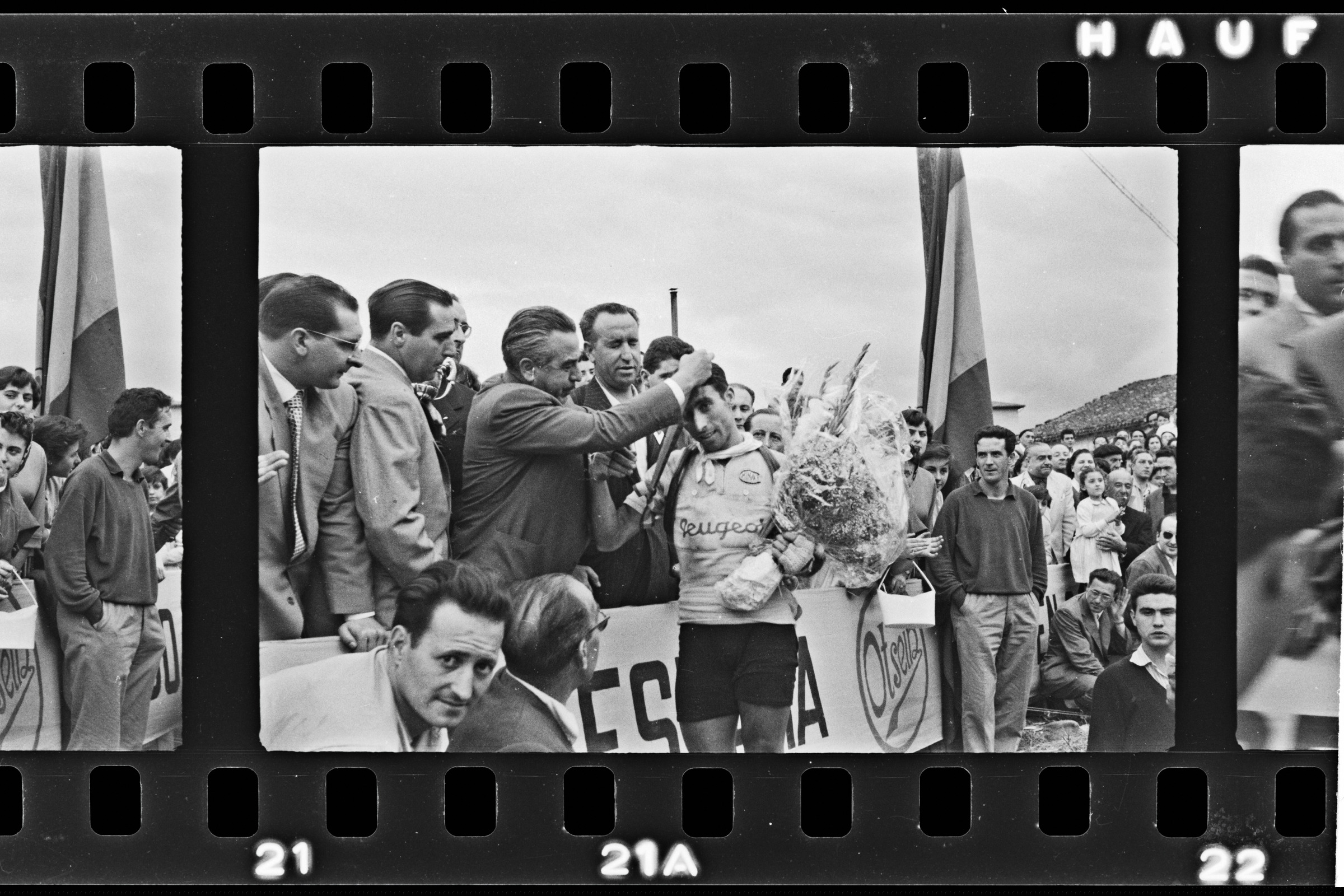| Ciclista recogiendo la banda de campeón | Campeonato de España fondo en carretera.- 5-8-956 |