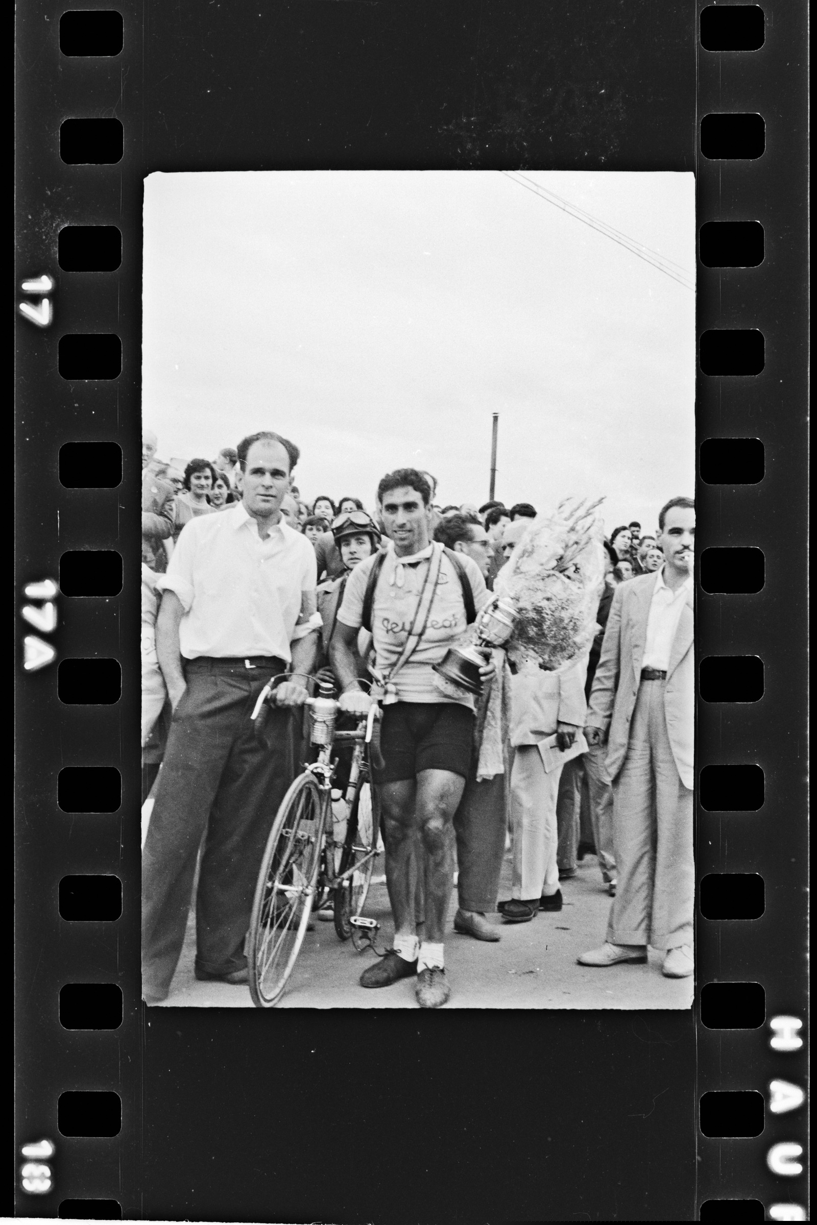 | Ciclista junto a un hombre con la banda y el ramo de flores | Campeonato de España fondo en carretera.- 5-8-956 |
