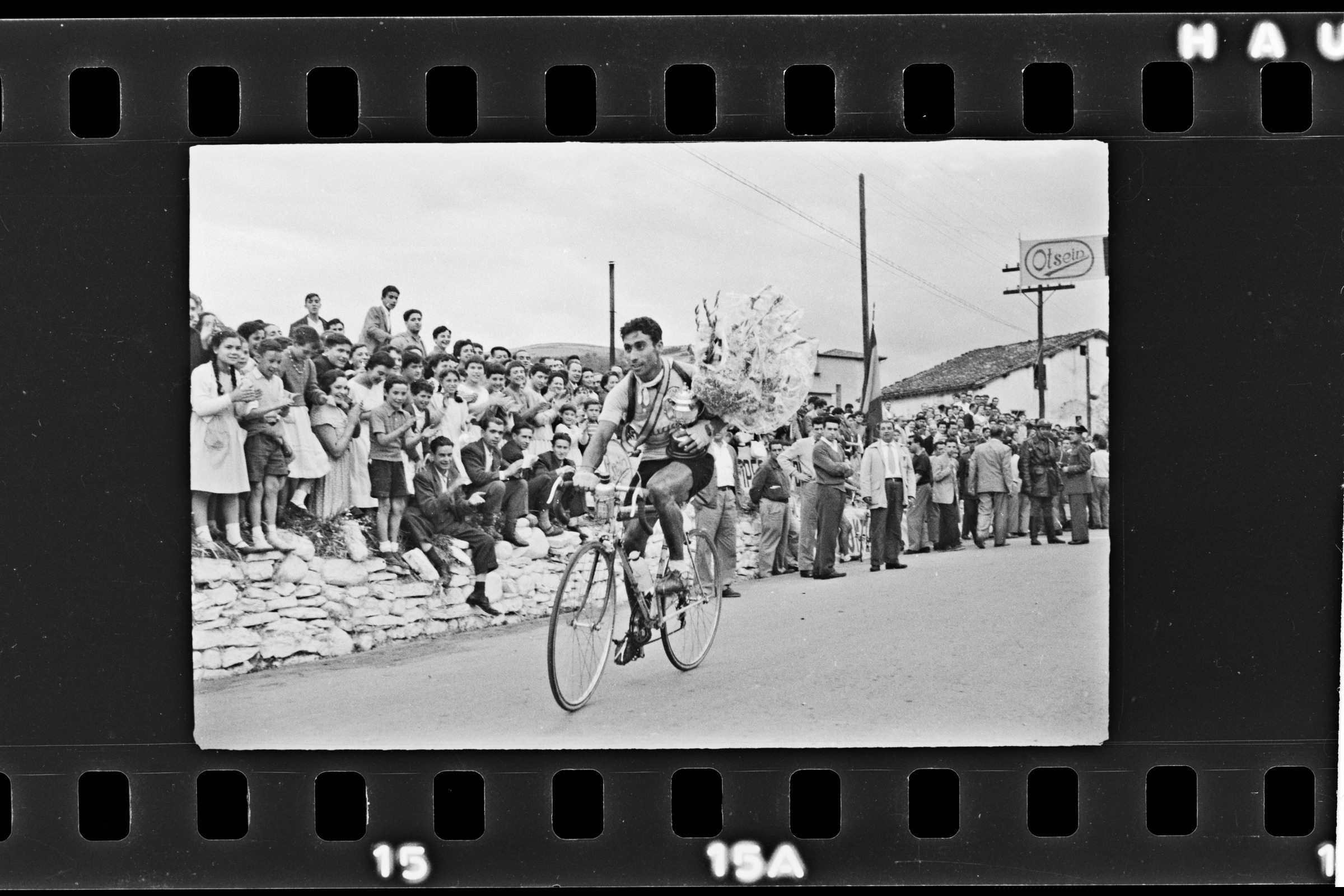 | Ciclista realizando un recorrido de honor con la banda y el ramo de flores | Campeonato de España fondo en carretera.- 5-8-956 |