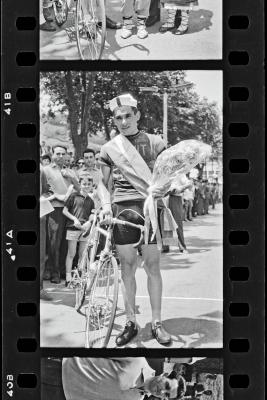| Ciclista con la banda de ganador y ramo de flores | En San Antonio. Ciclismo. Campeonato de Guipuzcoa de fondo en ruta. Aficionados. Vencedor: J. Aranzabal |