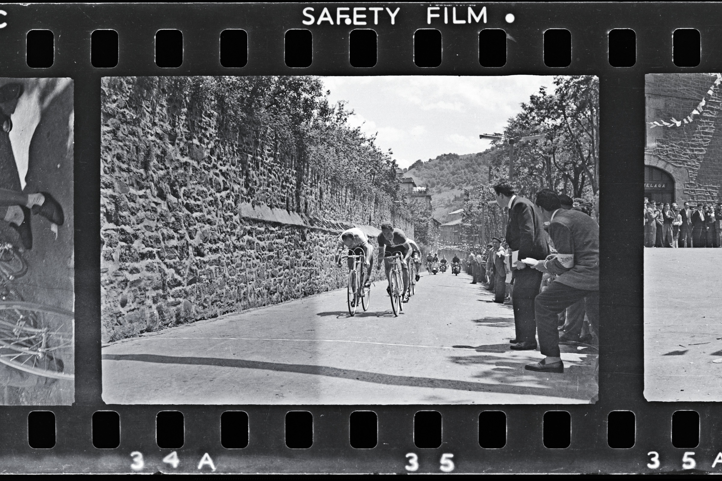 | Carrera cicilista de las fiestas de San Antonio: ciclistas subiendo hacia el Espolón | Ciclismo. San Antonio. Vencedor: Antonio Barrutia |