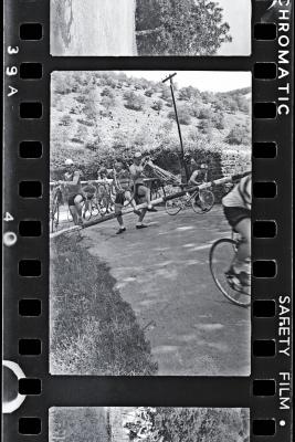 | Carrera ciclista de las fiestas de San Antonio: ciclistas cruzando bajo el paso a nivel | Ciclismo. San Antonio. Vencedor: Antonio Barrutia |