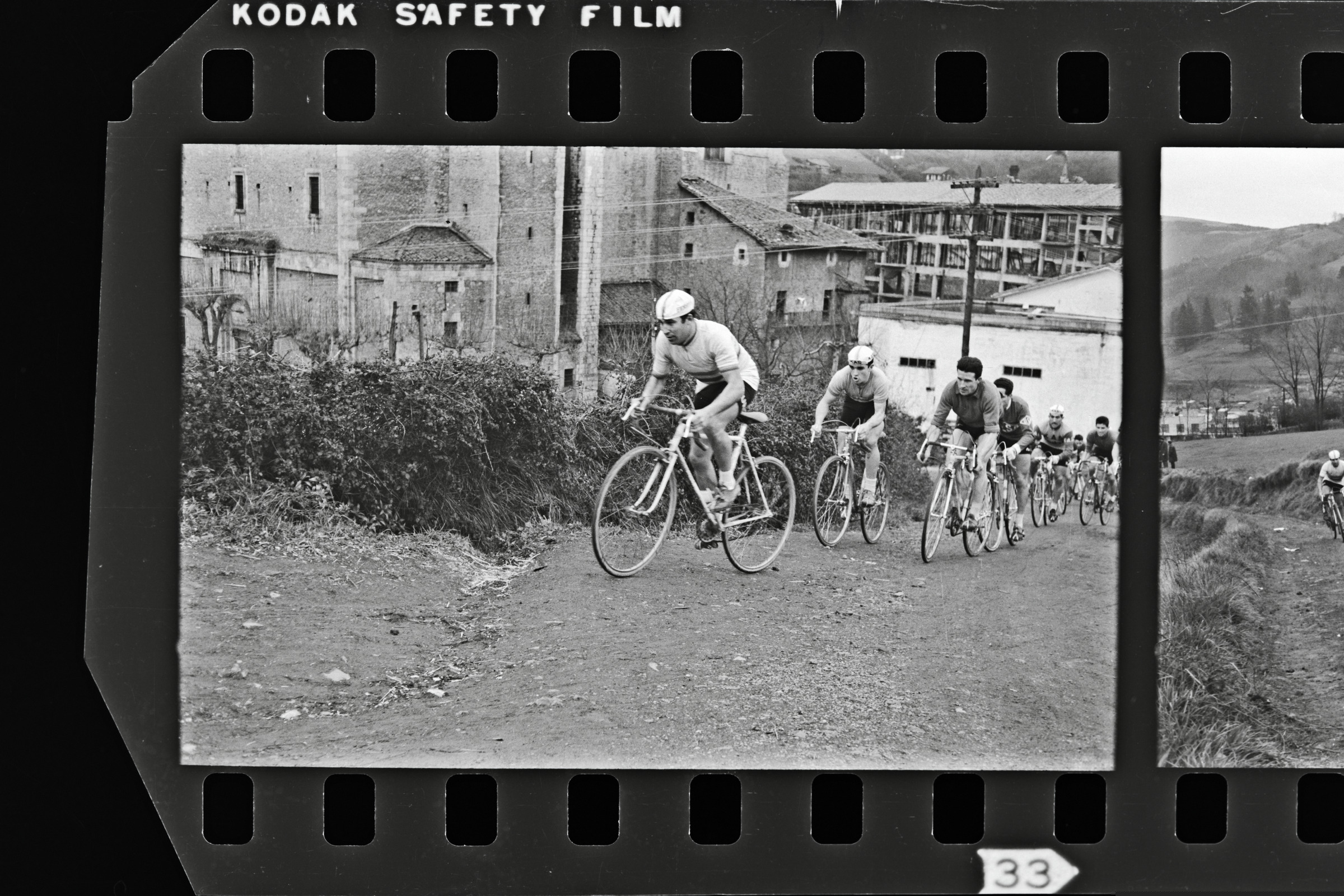 | Ciclistas en la carrera de ciclocross en el camino de San Marcial; en abajo la iglesia de Santa Marina y las casas de Galarza (Fraiskozuri) | Ciclo Cross. Vergara. Vencedor: Mendijur |