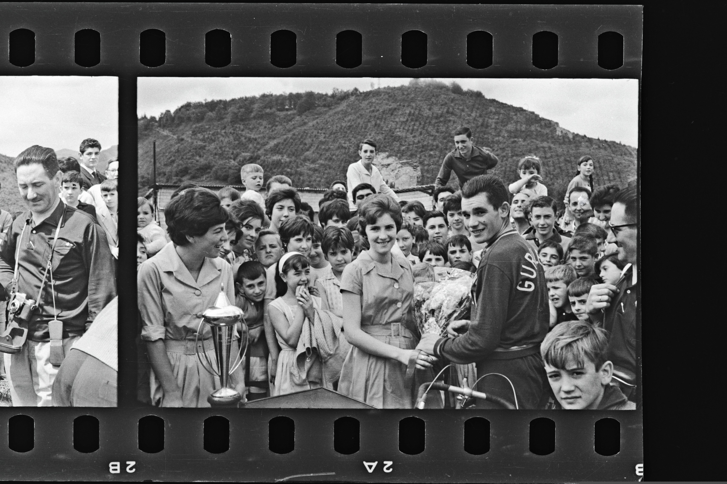| Ciclista recogiendo el ramo de flores del ganador | V premio San Lorenzo. Vencedor: Aranzabal |