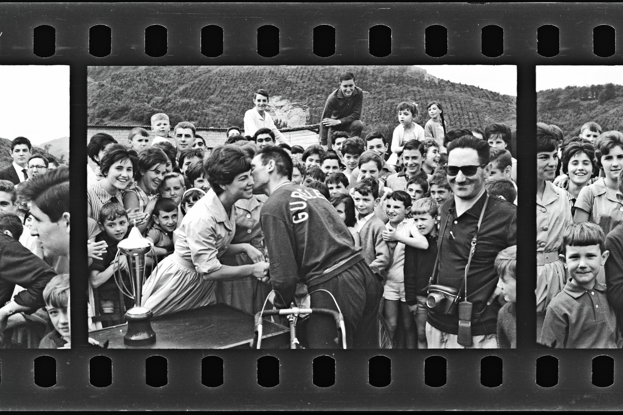 | Ciclista recogiendo el ramo de flores y el abrazo del ganador | V premio San Lorenzo. Vencedor: Aranzabal |