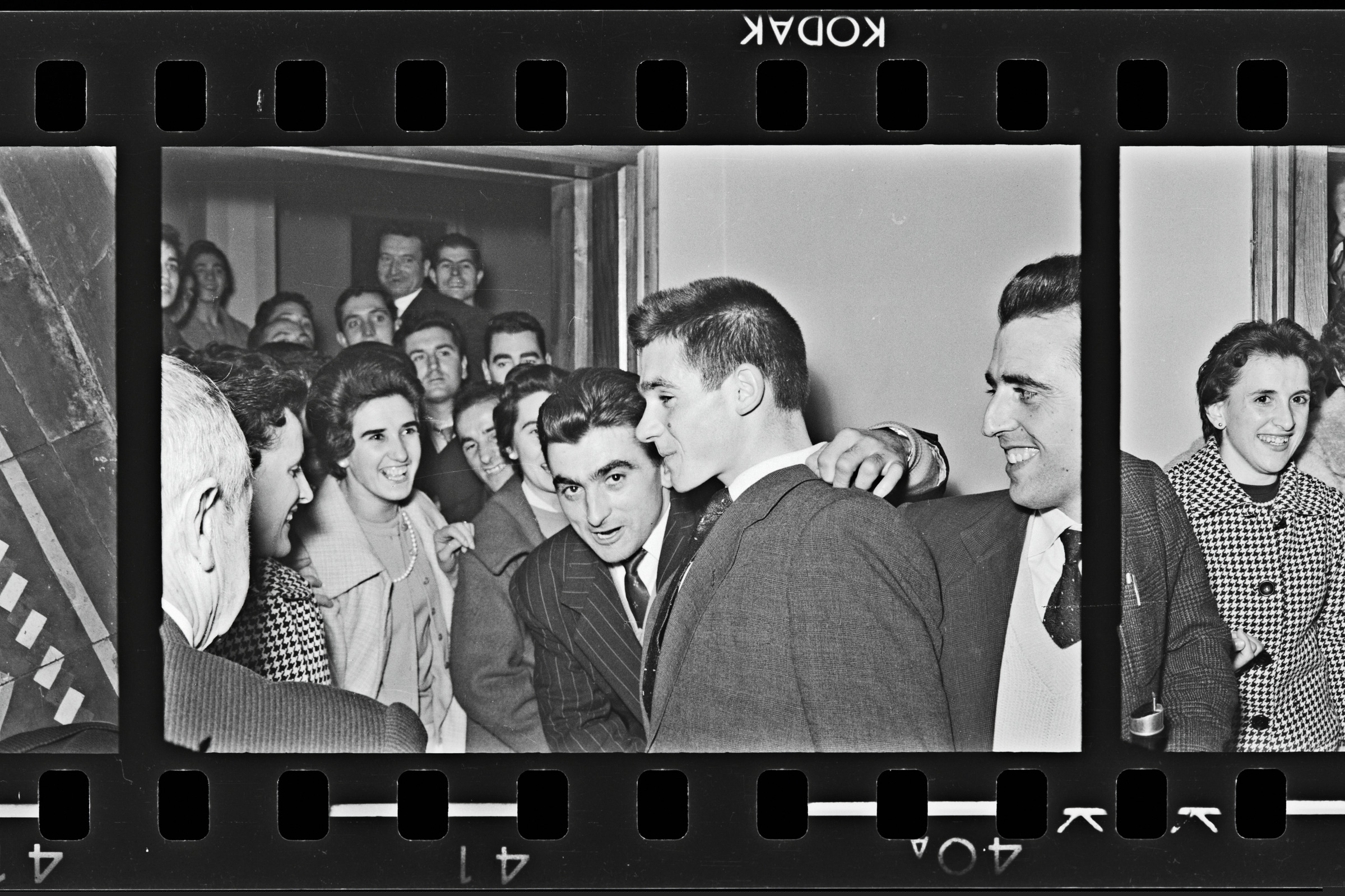 | Gente felicitando a un hombre en el Club Deportivo | Ciclismo. Record de los 100 km. San Sebastián - Ormaiztegui - San Sebastián. Vencedor: Jesús Aranzabal |