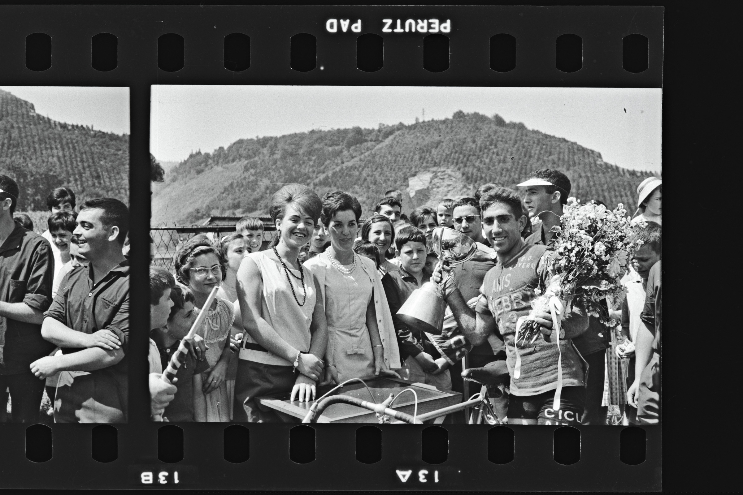 Ciclista del equipo Ginebra 3-3 recogiendo copoa y el ramo de flores. Rodeado de gente | Ciclismo. San Lorenzo. Vencedor. Mendijur |