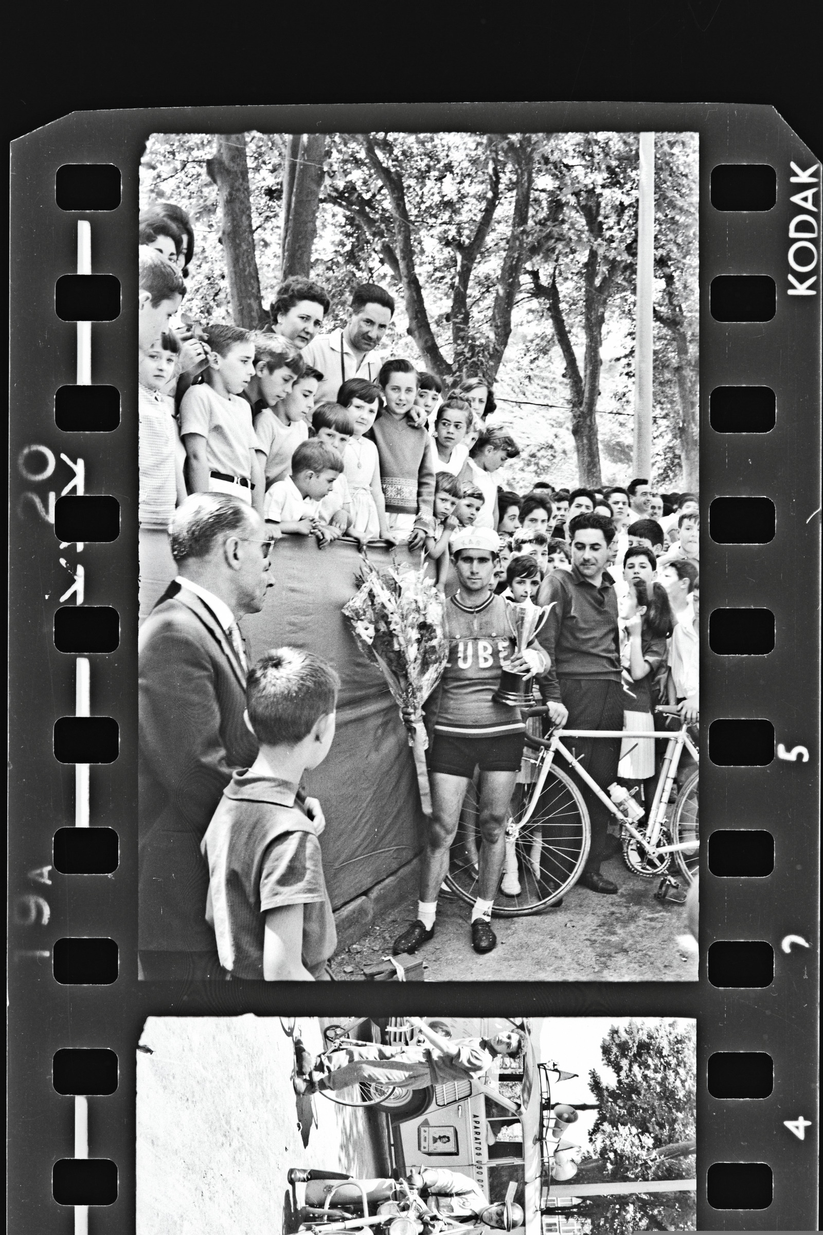 | Con flores y copas ciclistas del equipo Kube rodeado de gente bajo la tribuna | Ciclismo. San Antonio. Vencedor |