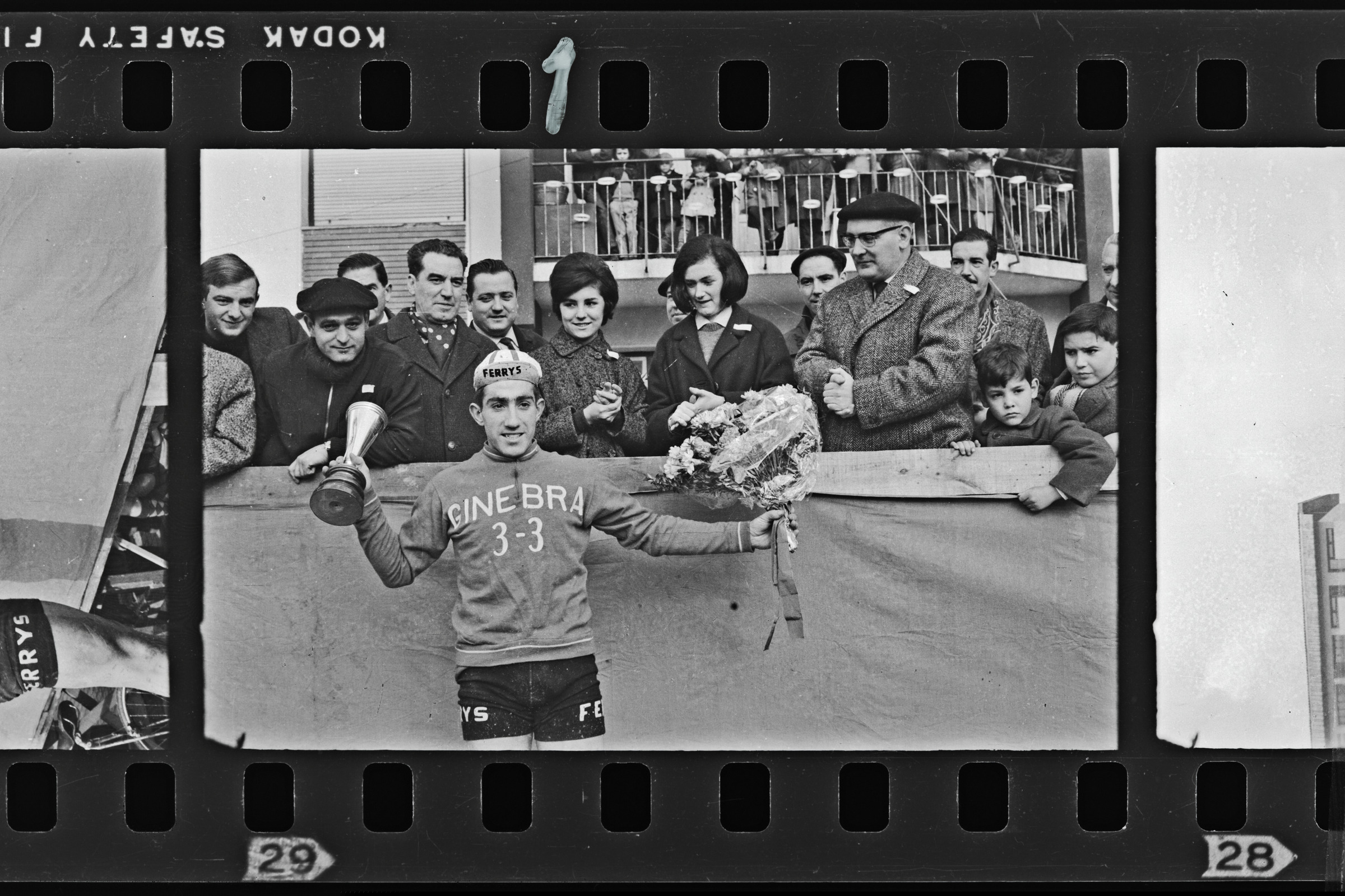 Entrega de premios de la carrera ciclista en Matxiategi kalea: el ciclista recogiendo la copa de manos del alcalde | Ciclo Cross. VII criterium Otsein. Vencedor: Mendijur |