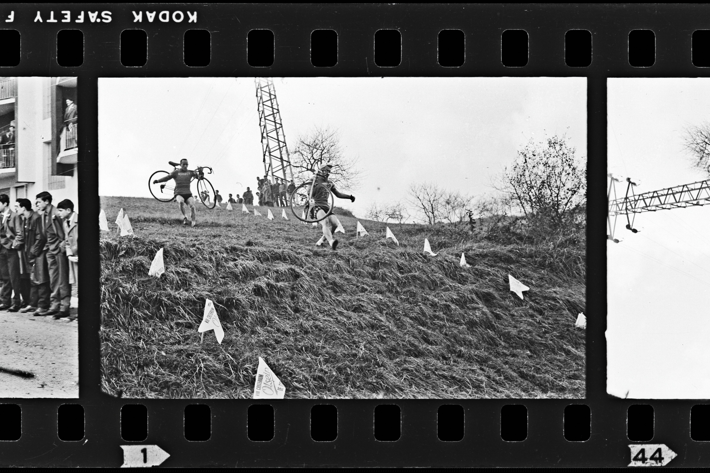| Ciclistas en ciclo-cross con la bicicleta encima | Ciclo Cross. VII criterium Otsein. Vencedor: Mendijur |