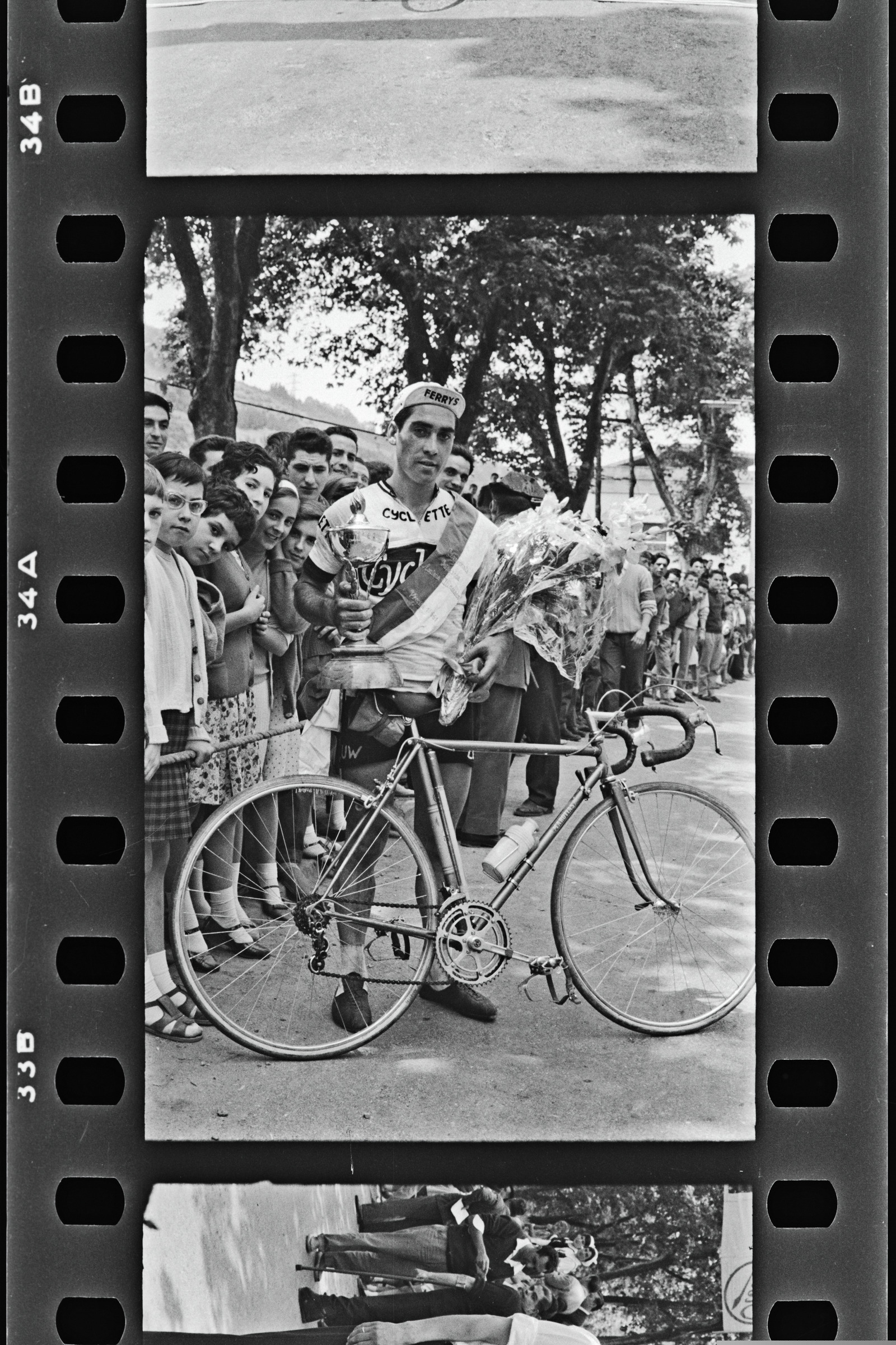 | Ciclista con el ramo de flores y copa | Ciclismo. Campeonato de Guipúzcoa de montaña. Aficionados. Vencedor: Marotias |