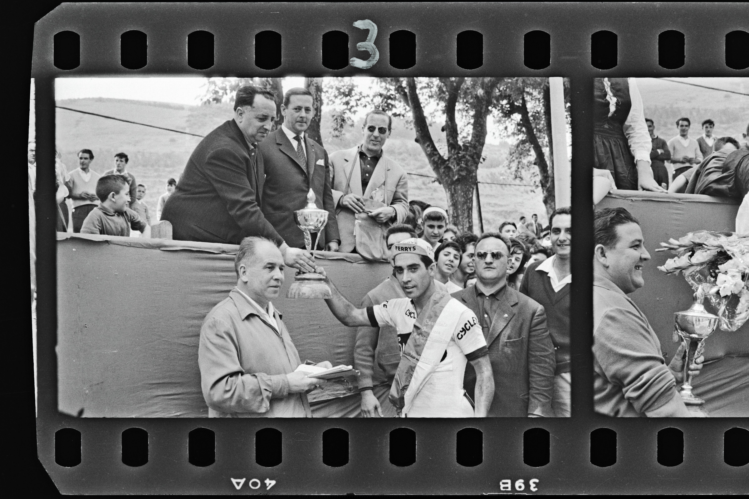 | Ciclista recogiendo la copa con banda | Ciclismo. Campeonato de Guipúzcoa de montaña. Aficionados. Vencedor: Marotias |