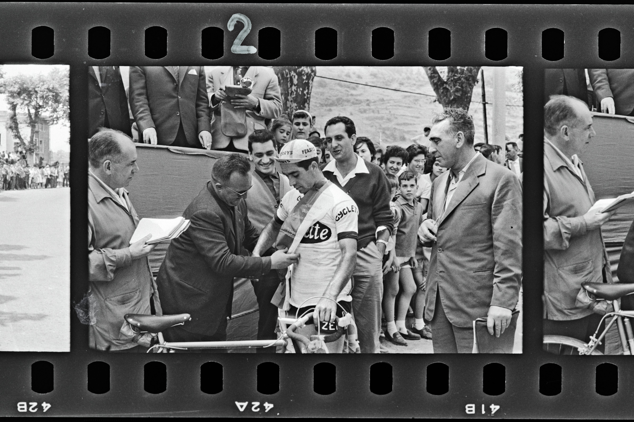| Ciclista recogiendo la banda | Ciclismo. Campeonato de Guipúzcoa de montaña. Aficionados. Vencedor: Marotias |