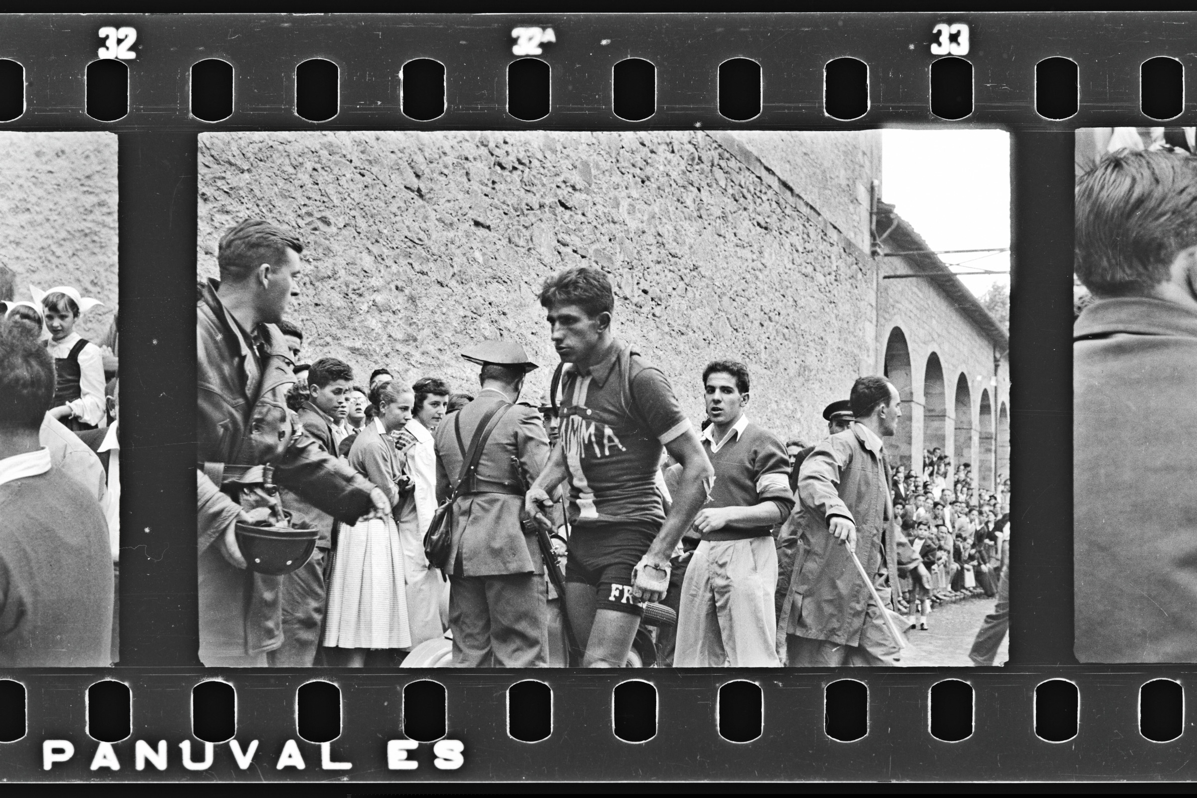 | Meta de la carrera ciclista en Antzuola: motorista con casco, guardia civil, ciclista, juez, | Ciclismo en Anzuola. Caída de C. Morales. Vencedor: |