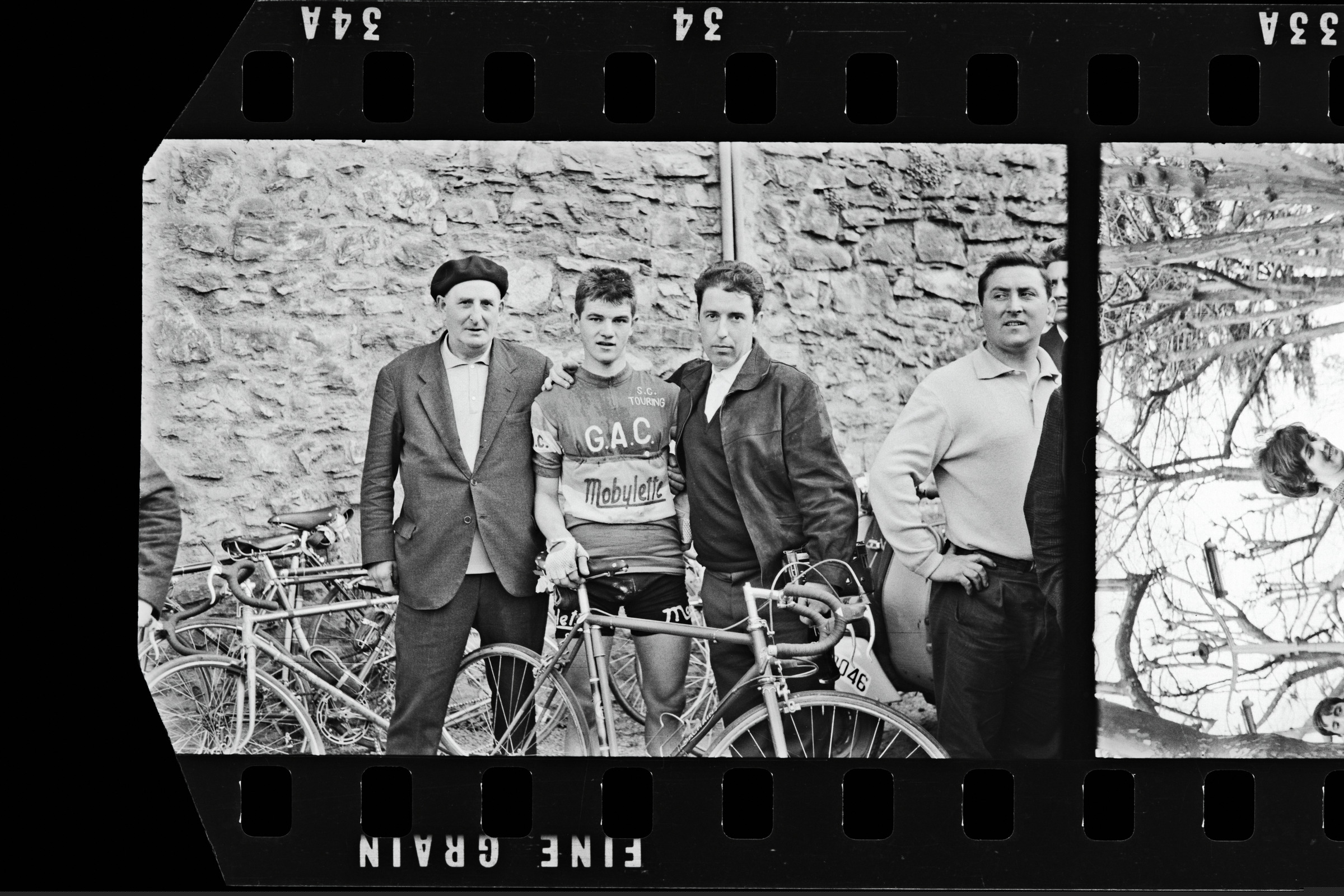 | Retrato de tres hombres, el del centro ciclista del equipo G.A.C. Mobylette | Ciclismo. III Criterium ciclista Algodonera de San Antonio. Vencedor: Perurena |