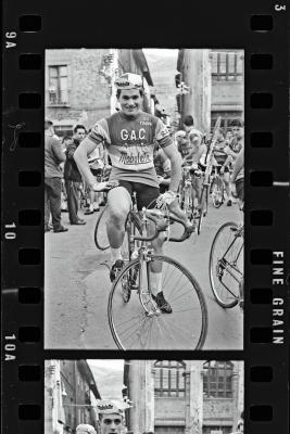| Ciclista del equipo G.A.C. en la salida de carrera en la plaza San Martín de Agirre | Ciclismo. III Criterium ciclista Algodonera de San Antonio. Vencedor: Perurena |