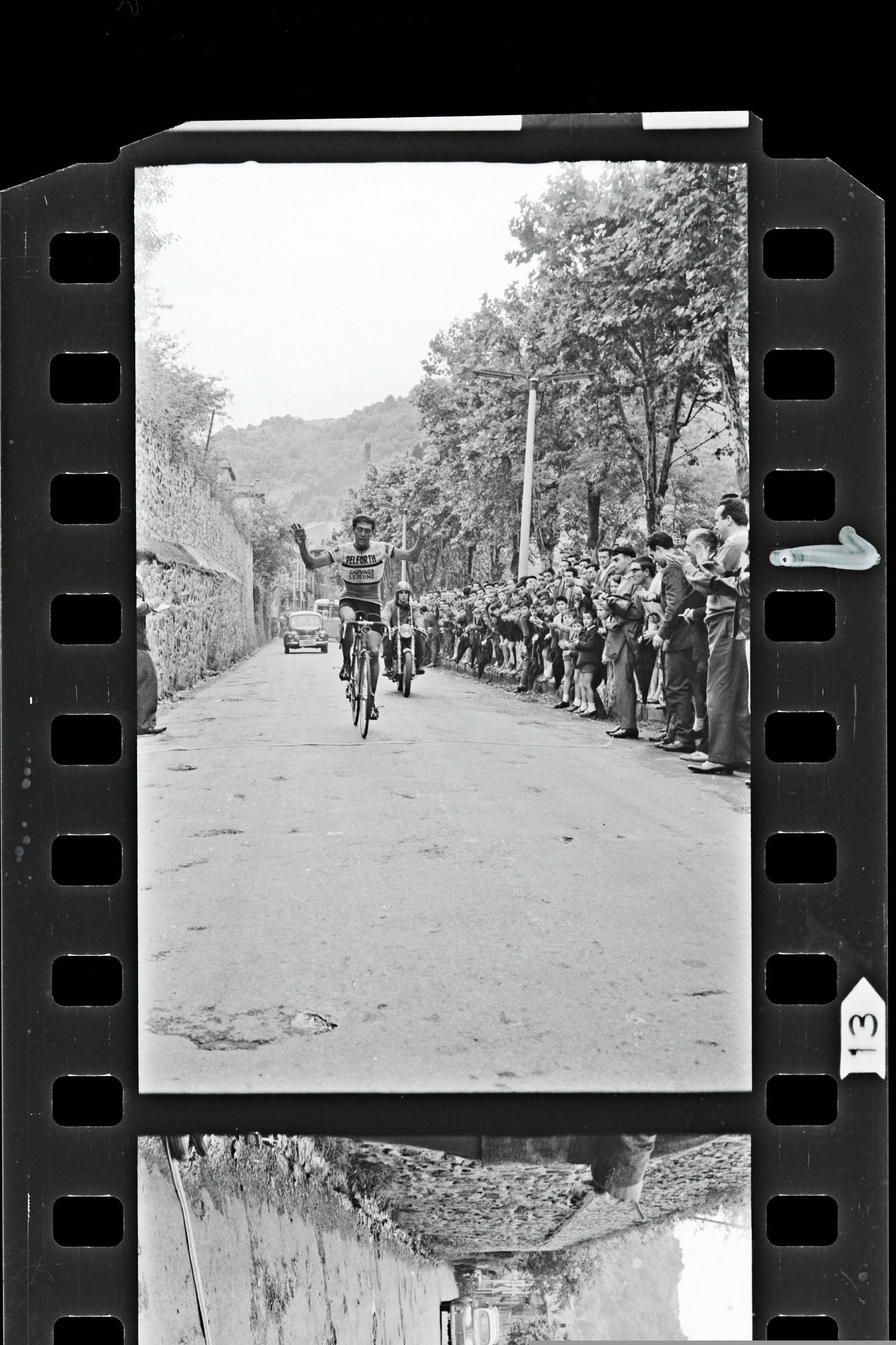 | El ciclista con los brazos levantados llegando a meta en el Espolón En el fondo la moto y el coche; en la cuneta el público aplaude | Ciclismo Premio San Antonio. Vencedor: Errandonea |