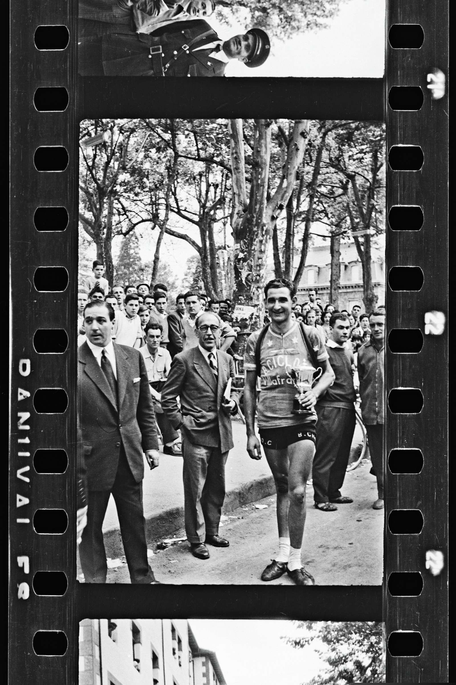 | Ciclista con copa en meta. Dos hombres a la izquierda y a la derecha, en el fondo un público | Ciclismo Pascuas de Pentecostés. Vencedor: Aspuru |