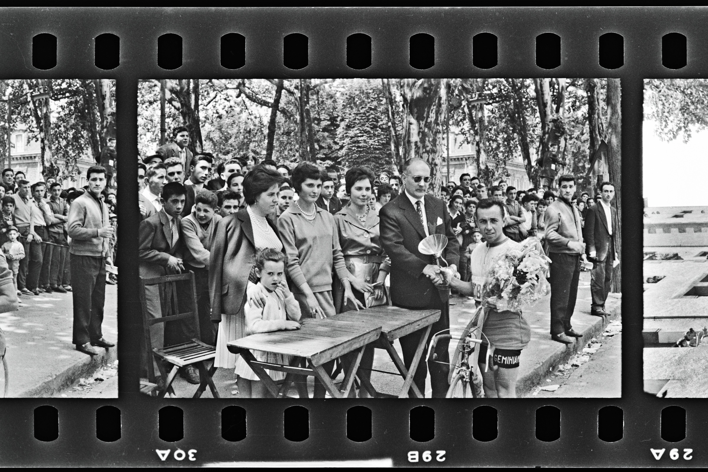 | Ciclista del equipo Caobania recibiendo la copa de la mano del alcalde | Ciclismo Pascuas de Pentecostés. Vencedor: |