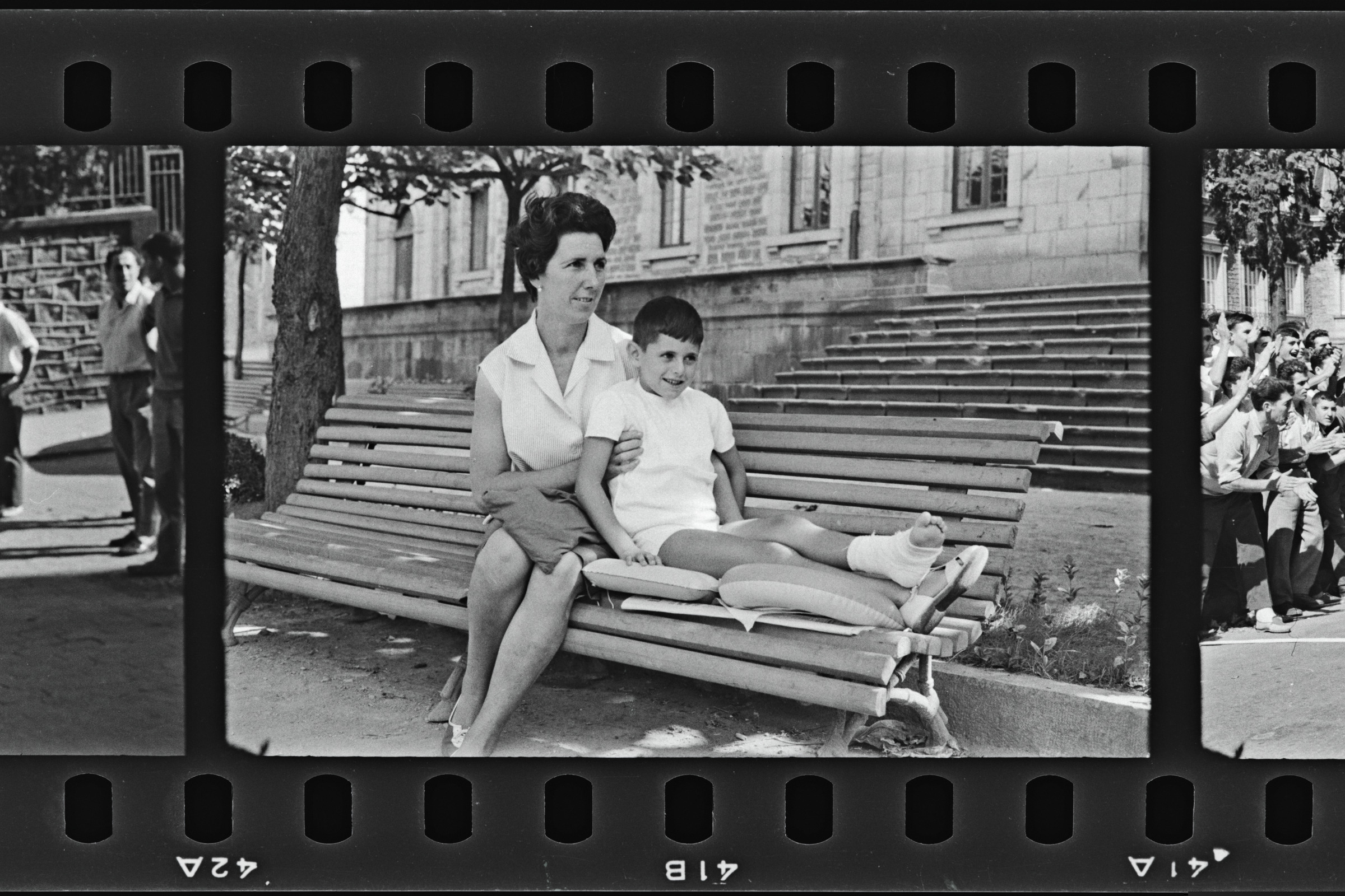 | Mujer y niño en un banco de la plaza de arriba. El niño está atado con una pierna vendada | Ciclismo Primer premio San Martin. Vencedor: Agote |