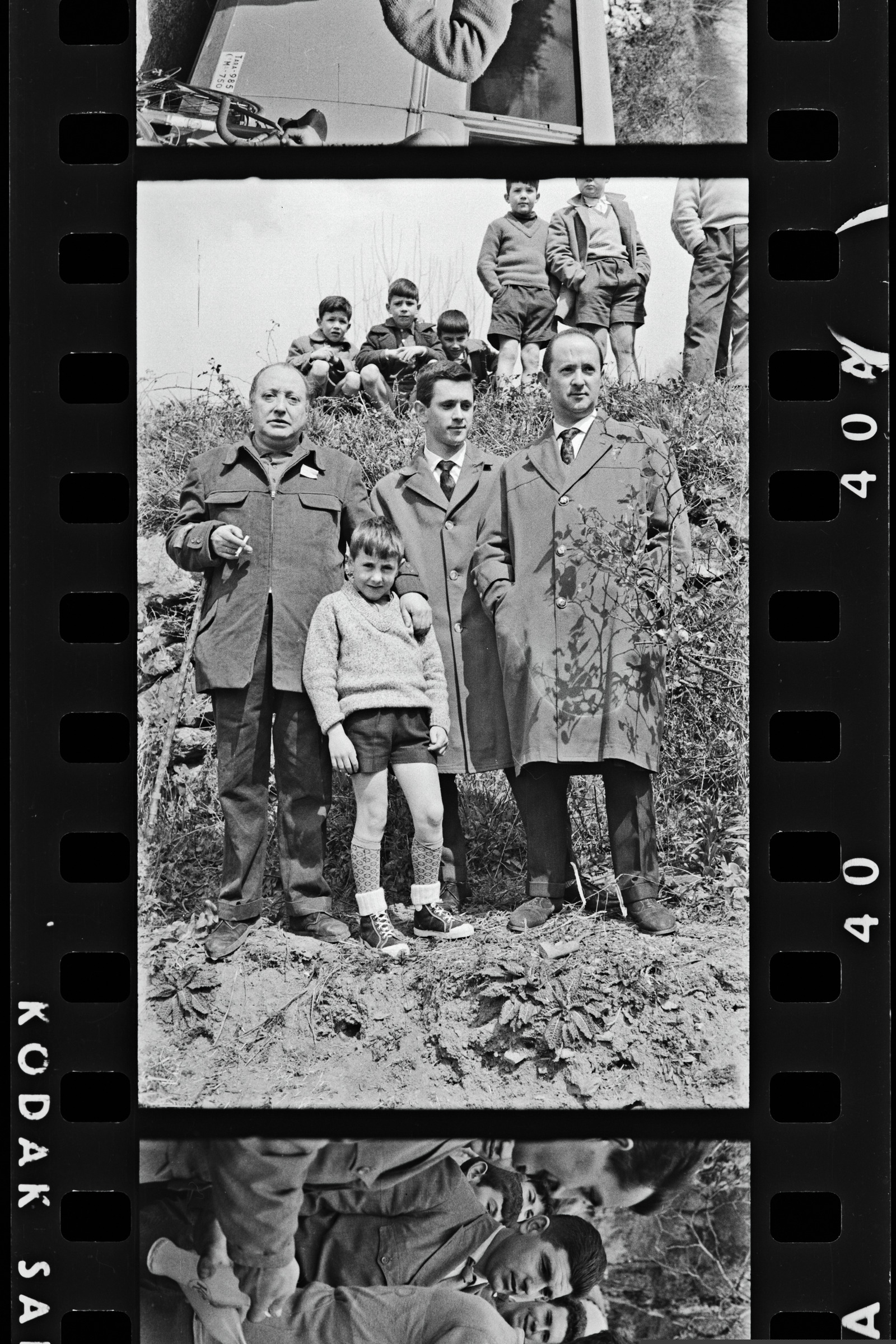 | Retrato de tres hombres y un niño, público de la carrera | Ciclismo. Anzuola. Segunda subida a Uzarraga. Vencedor: Malvar |